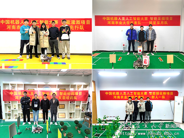 赛事自6月启动以来,共有来自清华大学、哈尔滨工业大学、上海交通大学、澳门大学、苏州大学、西安电子科技大学等400多所高校的万余名学子报名参赛。经过各省市地区赛的角逐,最终有1000多支优秀队伍晋级全国总决赛,我校机电工程学院组建的4支团队均以优异成绩代表河南赛区进入总决赛。经过激烈角逐,由田辉、赵宁老师指导,张驻军、王学良、时伊龙、魏来、周彦同学组建的“摘星采月队”凭借智能采摘机器人作品取得大赛智能采摘组一等奖;由肖亚涛、袁志华老师指导,刘恩光、张轲、赵唯、王佳同学组建的“节水先行队”凭借智能灌溉机器人作品取得大赛智能灌溉组一等奖;由丁攀、陈永老师指导,张轲、黄泽全、张驻军、刘恩光同学组建的“新人一队”凭借智能授花粉机器人作品取得大赛智能授粉组一等奖;由周培林、黄会男老师指导,杜伟、海文博、陈建行、张千芊同学组建的“灭霸喷药队”智能喷药机器人作品取得大赛智能喷药组一等奖。
