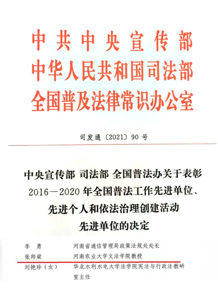 本网讯(通讯员 黄婉珺)近日,中央宣传部、司法部、全国普法办联合公布了2016—2020年全国普法工作先进单位、先进个人和依法治理创建活动先进单位名单。我校政策法规办公室副主任、文法学院教授张帅梁获评“全国普法工作先进个人”,是我校获此殊荣的第一人,也是全省高校两位获奖者之一。
