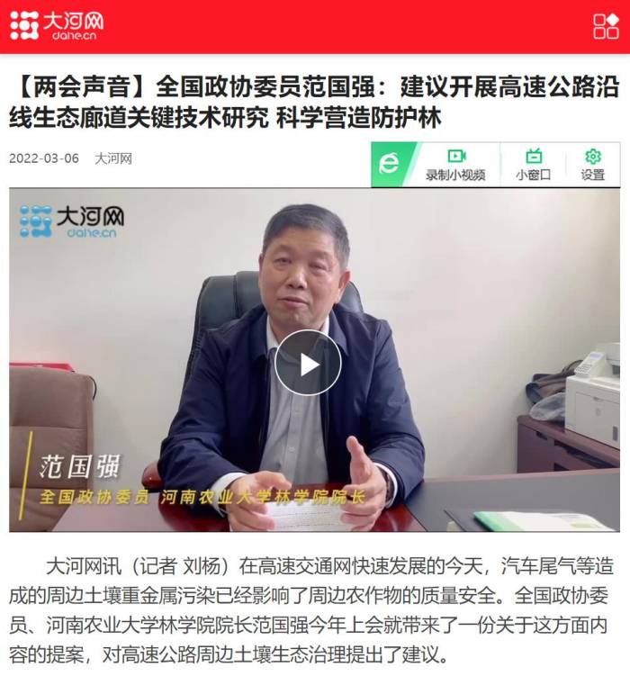 【大河网】(2022年3月6日)【两会声音】全国政协委员范国强:建议开展高速公路沿线生态廊道关键技术研究 科学营造防护林(点击图片查阅相关报道)