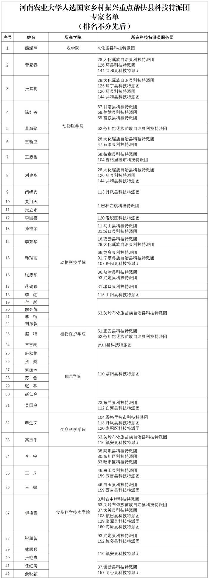 此次国家科技特派员选派是按照受援单位发布技术需求、科技人员申请、主管部门审核推荐、择优选派等程序最终予以确定。我校此次入选的42名专家将参加63个团次,专业涵盖农作物、畜牧养殖、植物保护、微生物、食用菌、食品加工、瓜果蔬菜等多个行业产业。专家们将走出河南、走出中原,到祖国最需要的地方,推动当地产业发展,强化科技和人才支撑,为巩固脱贫攻坚成果、助推乡村振兴贡献农大智慧、农大力量。
