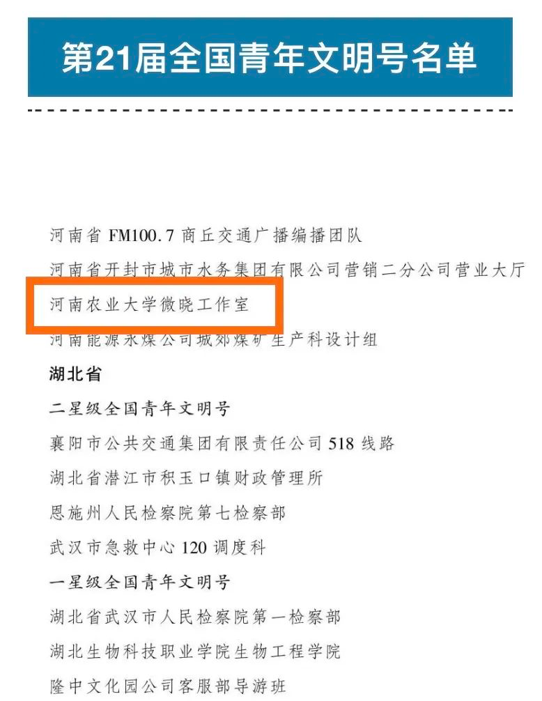 本网讯(通讯员 石瑾瑾)近日,全国创建青年文明号活动组委会成员单位联合印发《关于命名第21届全国青年文明号并进行星级认定的决定》,全国共7所高校入选,我校团委微晓工作室榜上有名。
