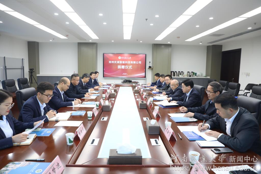本网讯(通讯员 张倩 图片 黄璞)11月7日,郑州优美智能科技有限公司捐赠仪式在龙子湖校区举行。校党委副书记游舸、副校长郭战伟、郑州优美智能科技有限公司总经理、96级校友李忠一行出席捐赠仪式。校团委、校友联络办公室、学校教育发展基金会、机电工程学院负责人参加捐赠仪式。校友联络办公室主任胡明忠主持仪式。