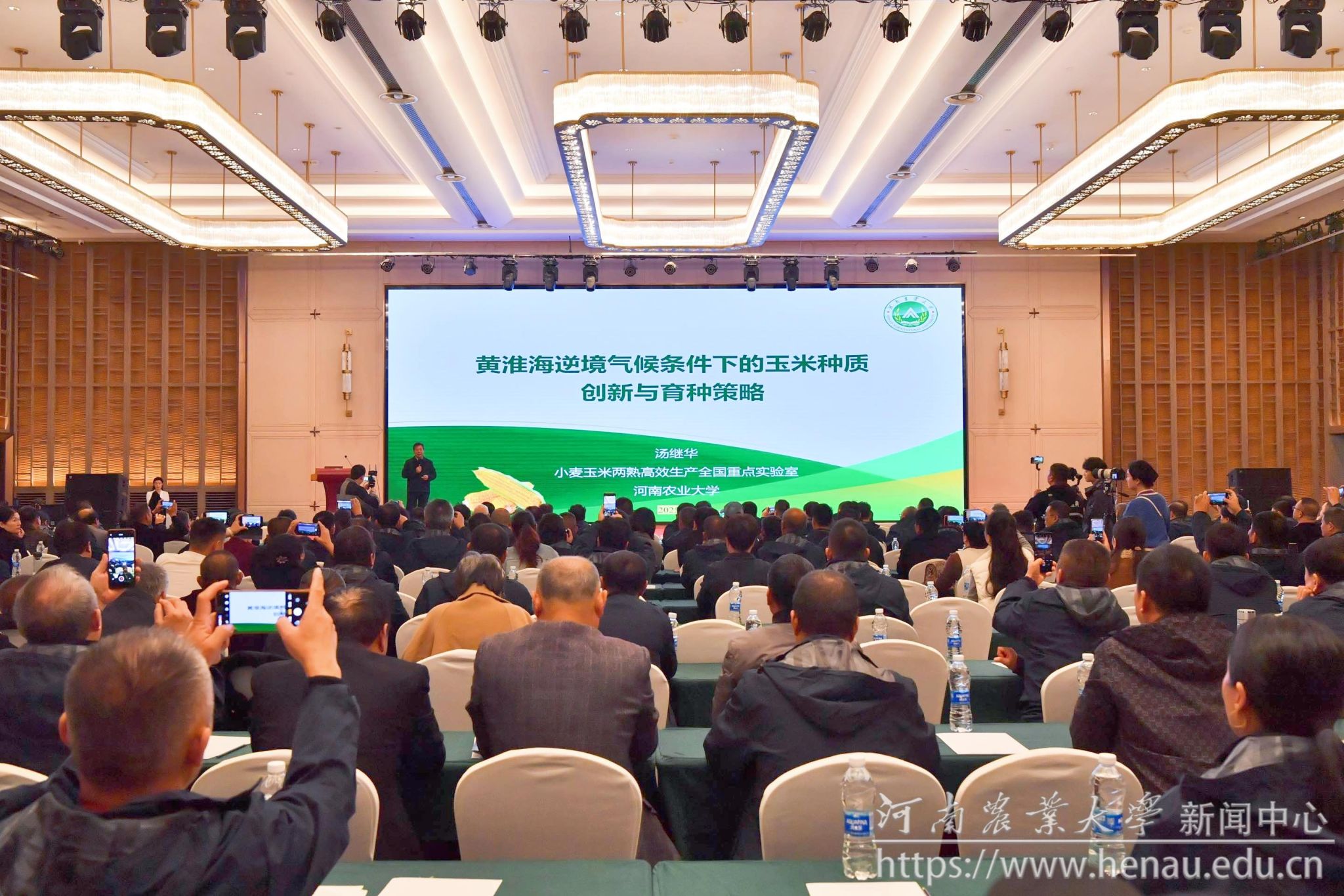 农学院负责人详细介绍了学校玉米育种的发展态势。汤继华作了《黄淮海逆境气候条件下的玉米种质创新与育种策略》专题报告,详细介绍了黄淮海夏玉米生产面临的问题、抗逆玉米育种目标及育种策略等方面的内容。汤继华详细阐述了所在团队的玉米新品种研发历程、技术突破以及未来的科研规划。汤继华表示,团队将继续围绕国家和产业急需进行有组织、“有用处”的科研,让更多农业科研成果从实验室走向田间地头,为保障国家粮食安全和促进农业高质量发展贡献更多科技力量。