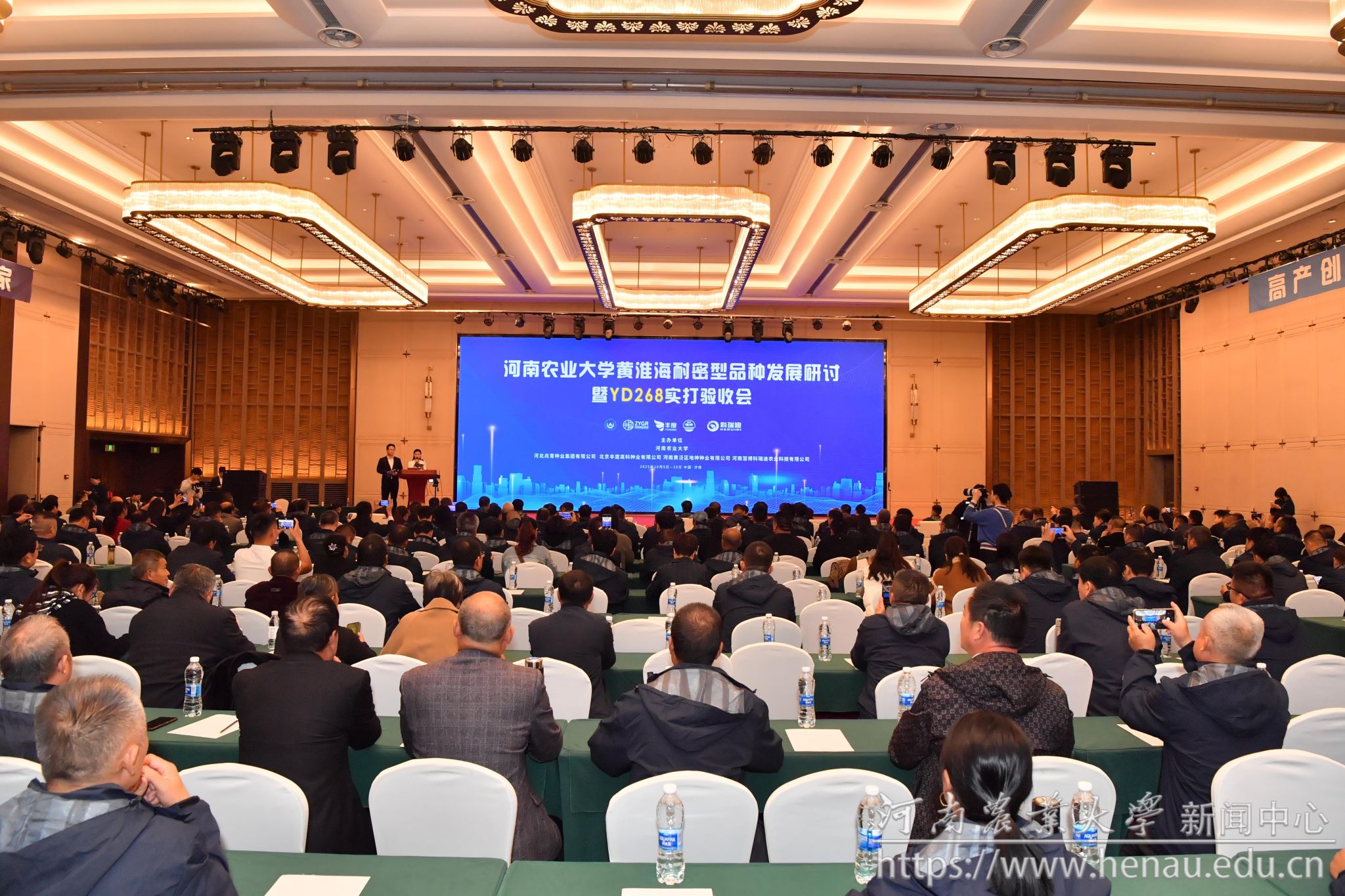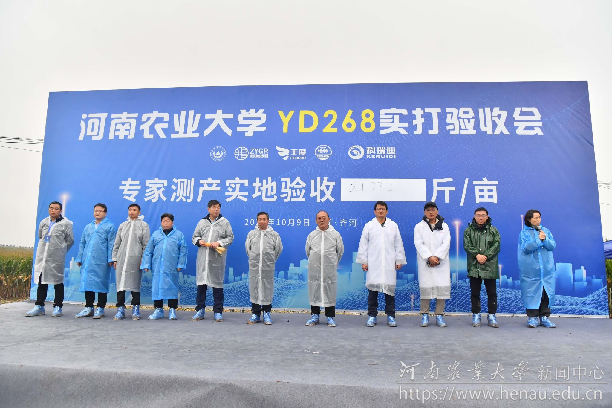学术副校长、YD268育种团队负责人汤继华,社会服务处、农学院负责人,YD268育种团队成员,河北兆育种业集团有限公司、北京丰度高科种业有限公司、河南黄泛区地神种业有限公司、河南慧博科瑞迪农业科技有限公司主要负责人,以及来自黄淮海玉米主产区8个省区的种子经销商和种粮大户共600余人,现场见证YD268的现场测产。