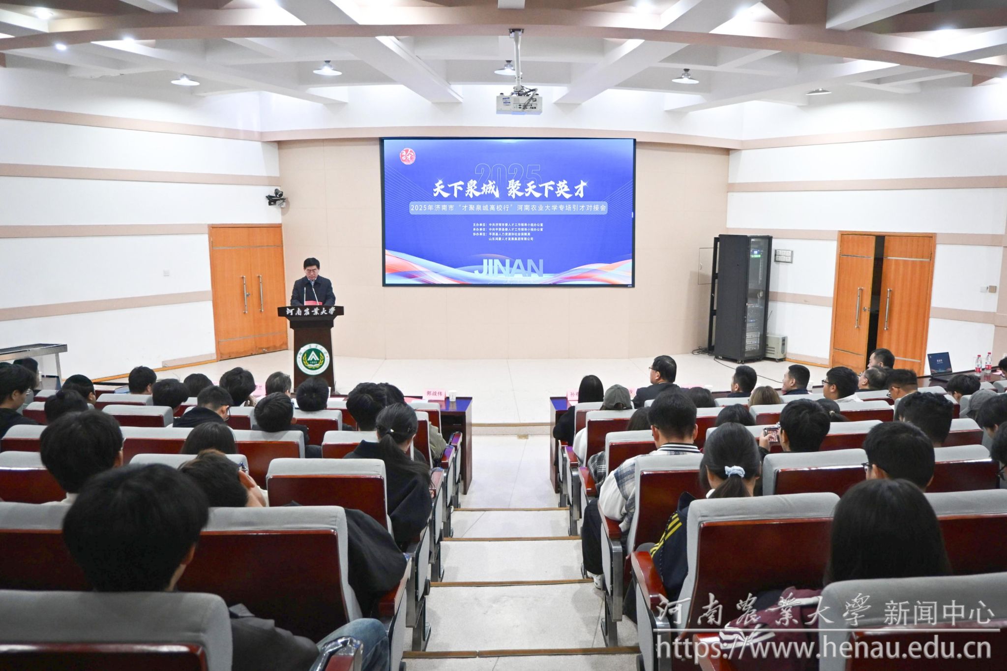 本网讯(通讯员 胡亭亭 李碧莹 王鹏)10月31日,济南市2025年秋季“才聚泉城高校行”专场宣讲招聘会在文化路校区举办。副校长郭战伟出席会议。济南市农业农村局科技教育处处长孙春华、平阴县委组织部副部长、县人社局党组书记、局长汝涛携济南市10家龙头企事业单位参加会议。