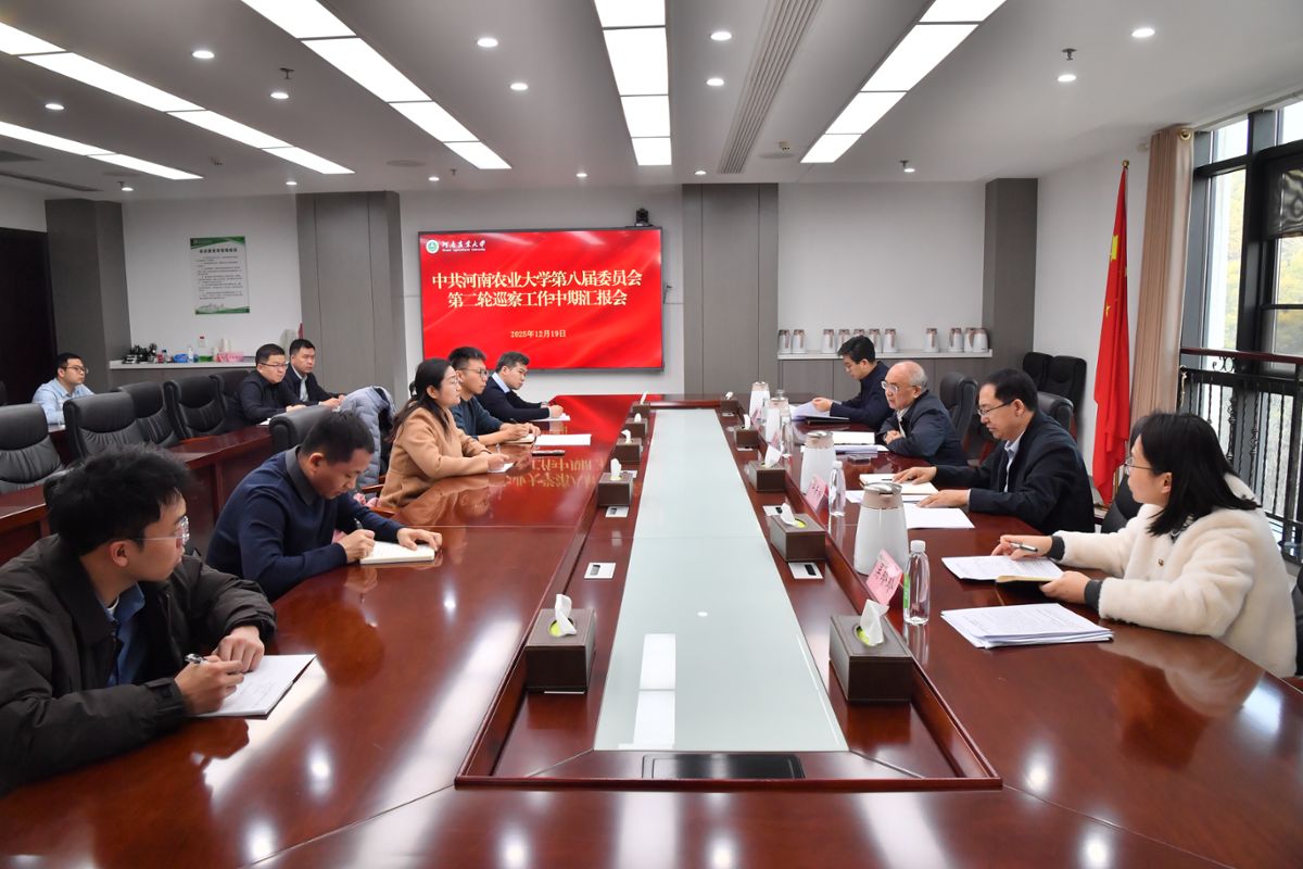 本网讯(通讯员 李金朋)12月19日,八届党委第二轮巡察中期汇报会在龙子湖校区召开。会议听取了第二轮巡察工作阶段性进展情况汇报,研究部署下一步巡察重点工作。校党委副书记、巡察工作领导小组副组长游舸受校党委书记岳杰勇委托主持并讲话。校党委巡察工作领导小组成员单位负责同志出席会议。巡察组、专业保障组、党委巡察工作办公室人员参加会议。