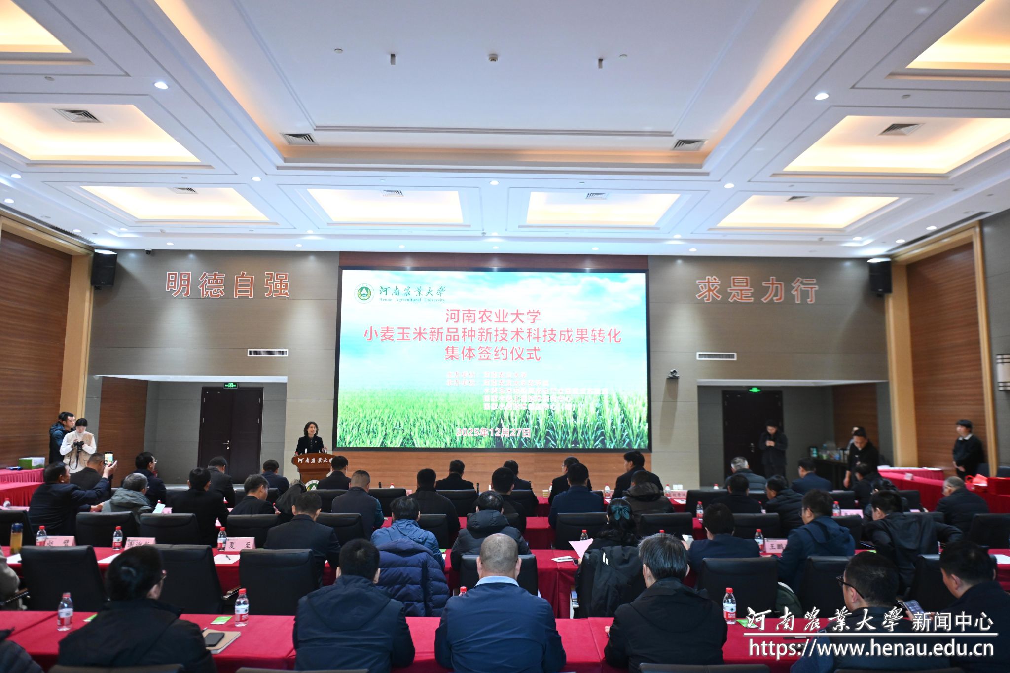本网讯(通讯员 徐佳亮 睢福庆)12月27日,学校小麦玉米新品种新技术科研成果转化集体签约仪式在龙子湖校区举行,副校长赵鹏、汤继华出席仪式,社会服务处、农学院负责人及相关专家,江苏省大华种业集团有限公司等17家种业企业负责人参加会议。