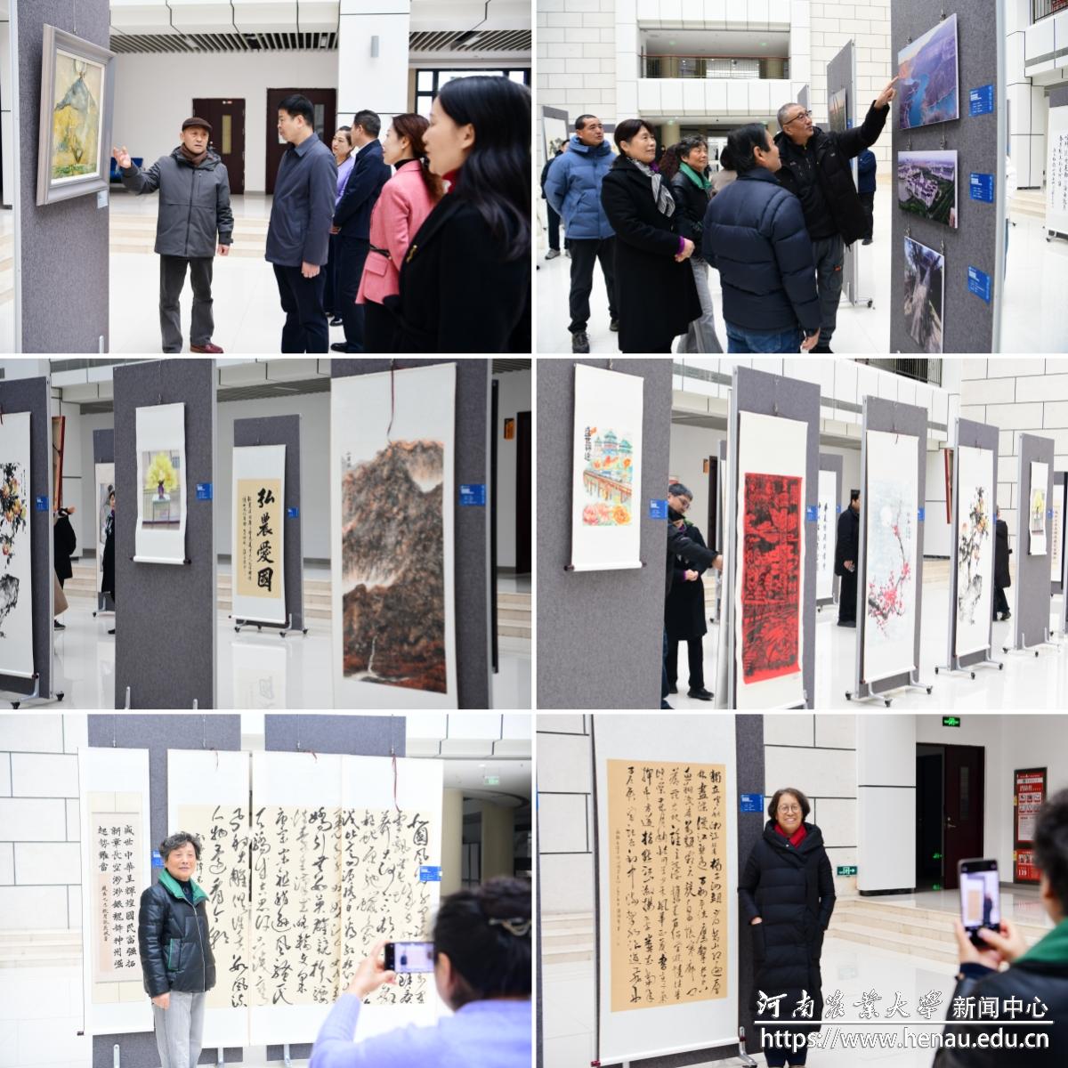 本网讯(通讯员 王力斌 图片 石瑾瑾)12月31日,学校“墨韵歌盛世 绘影谱新篇”教职工书画摄影展在龙子湖校区开幕。河南省美术家协会常务副主席、秘书长陈文利,校党委副书记、工会主席邹松涛出席活动。相关职能部门负责人、基层工会主席、参展教职工代表,以及书画摄影艺术爱好者们现场鉴赏了获奖书画摄影作品。