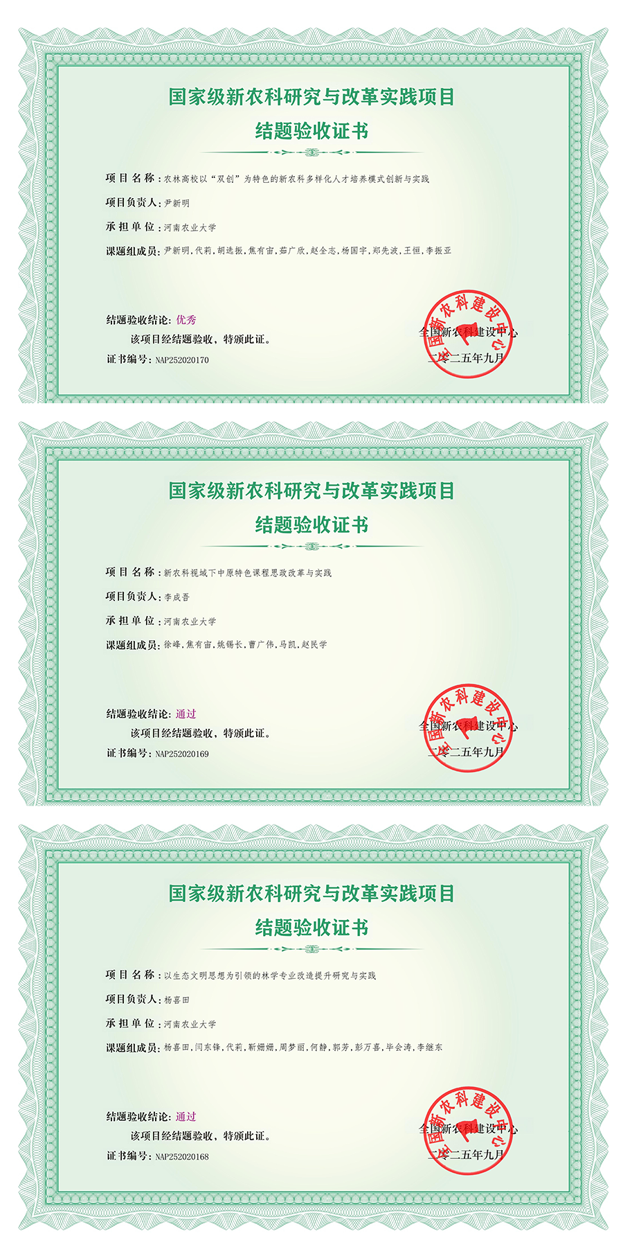 3项新农科国家级教学改革与研究项目全部高质量通过教育部验收,其中1项获评“优秀”。这些项目聚焦农林教育前沿问题,形成了可推广的改革经验,为深化农林教育教学改革提供了实践案例。