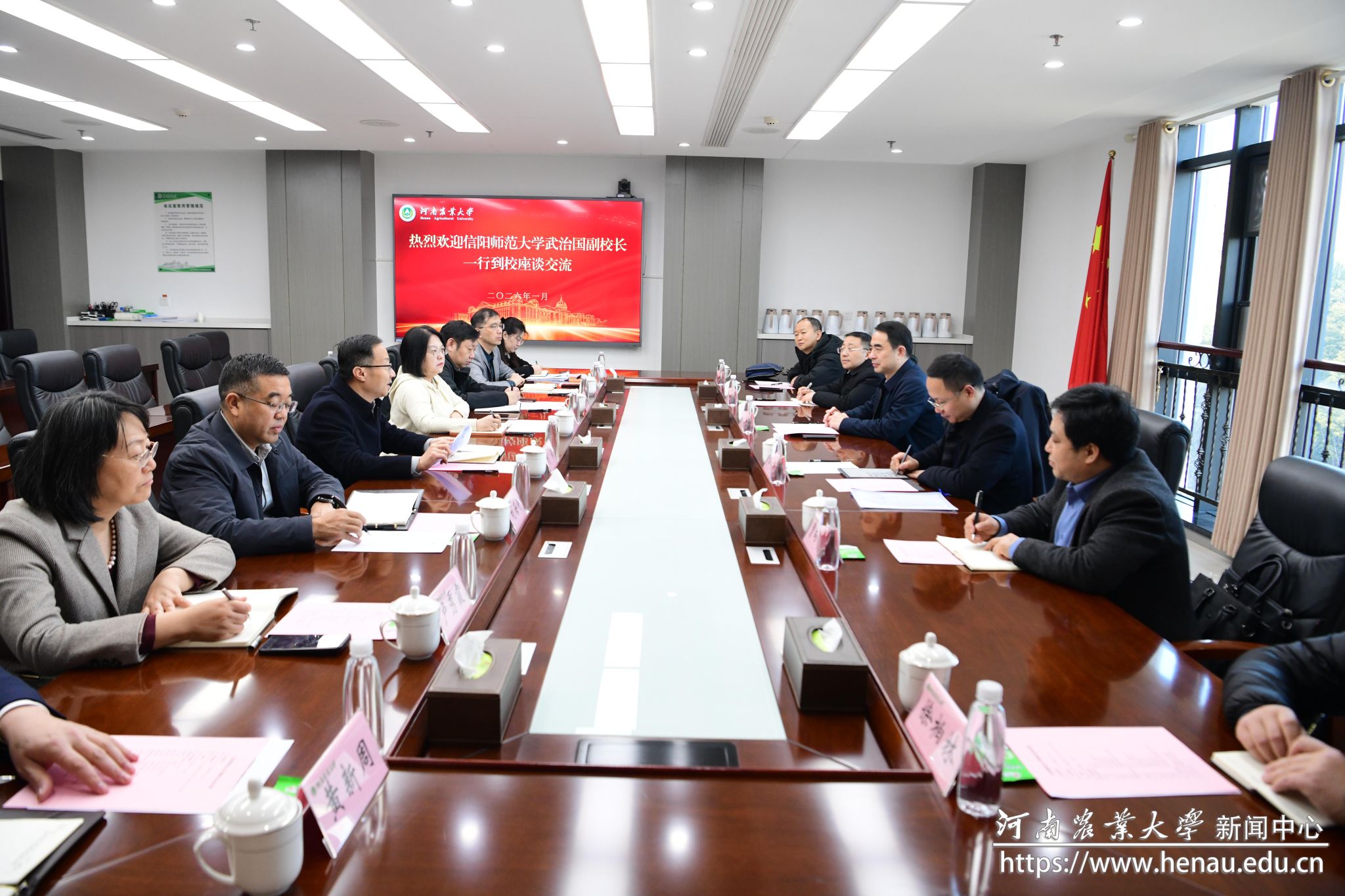 本网讯(通讯员 张琨 图片 石瑾瑾)1月15日,信阳师范大学副校长武治国一行来校调研交流。校党委书记岳杰勇会见武治国一行。副校长马菲出席座谈会。学校相关职能部门负责人参加会议。