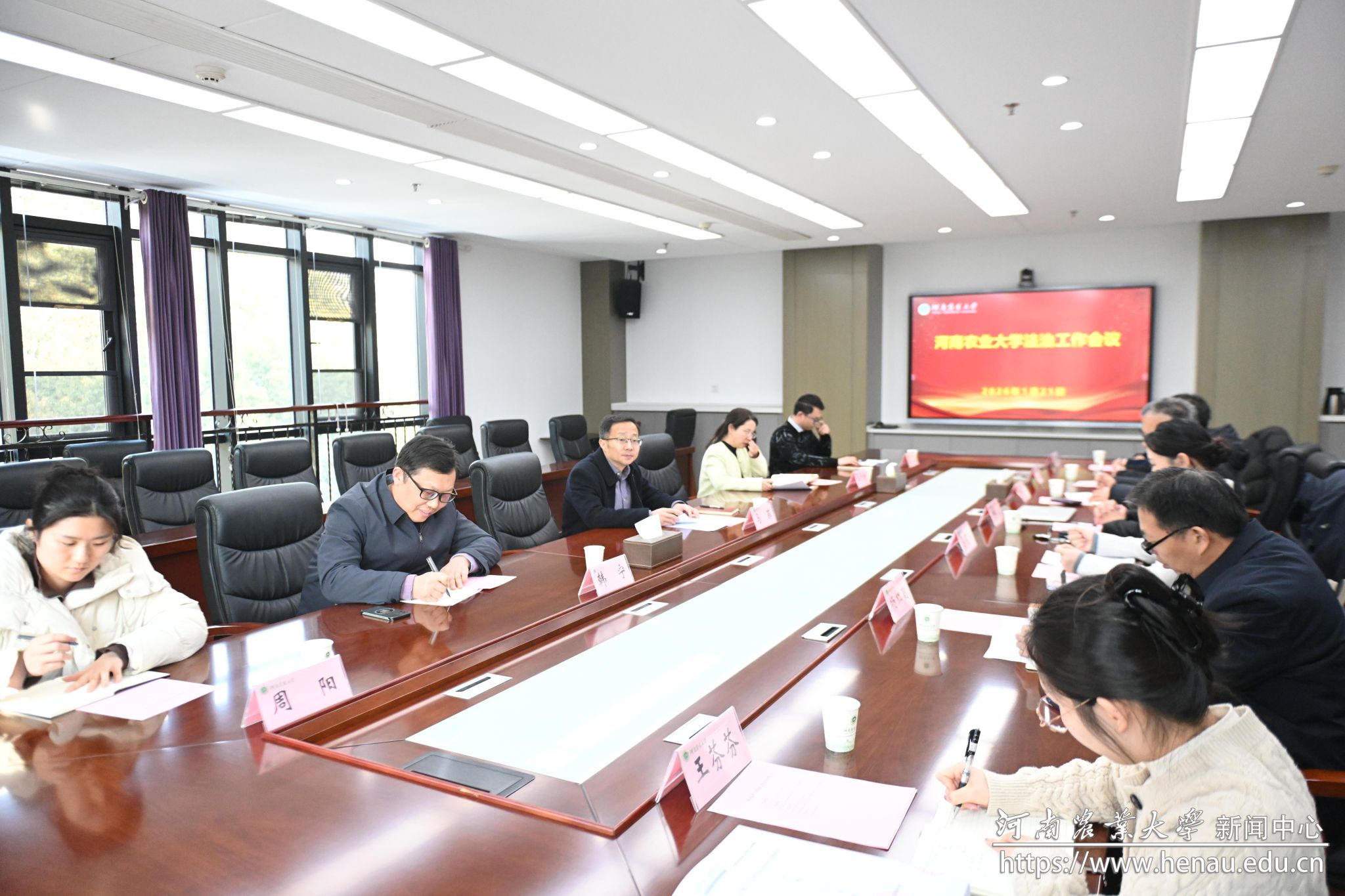 本网讯(通讯员 周阳 图片 李培亚)1月21日,学校在龙子湖校区召开法治工作会议。副校长马菲出席会议,校内外法律顾问,文法学院、政策法规办公室负责人,政策法规办公室全体工作人员参加会议。