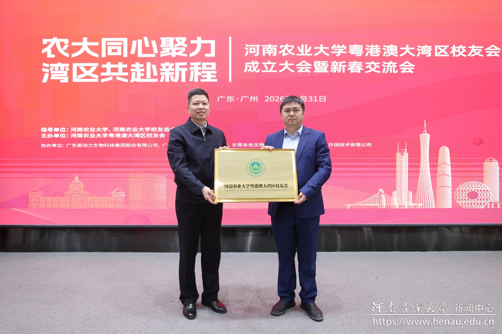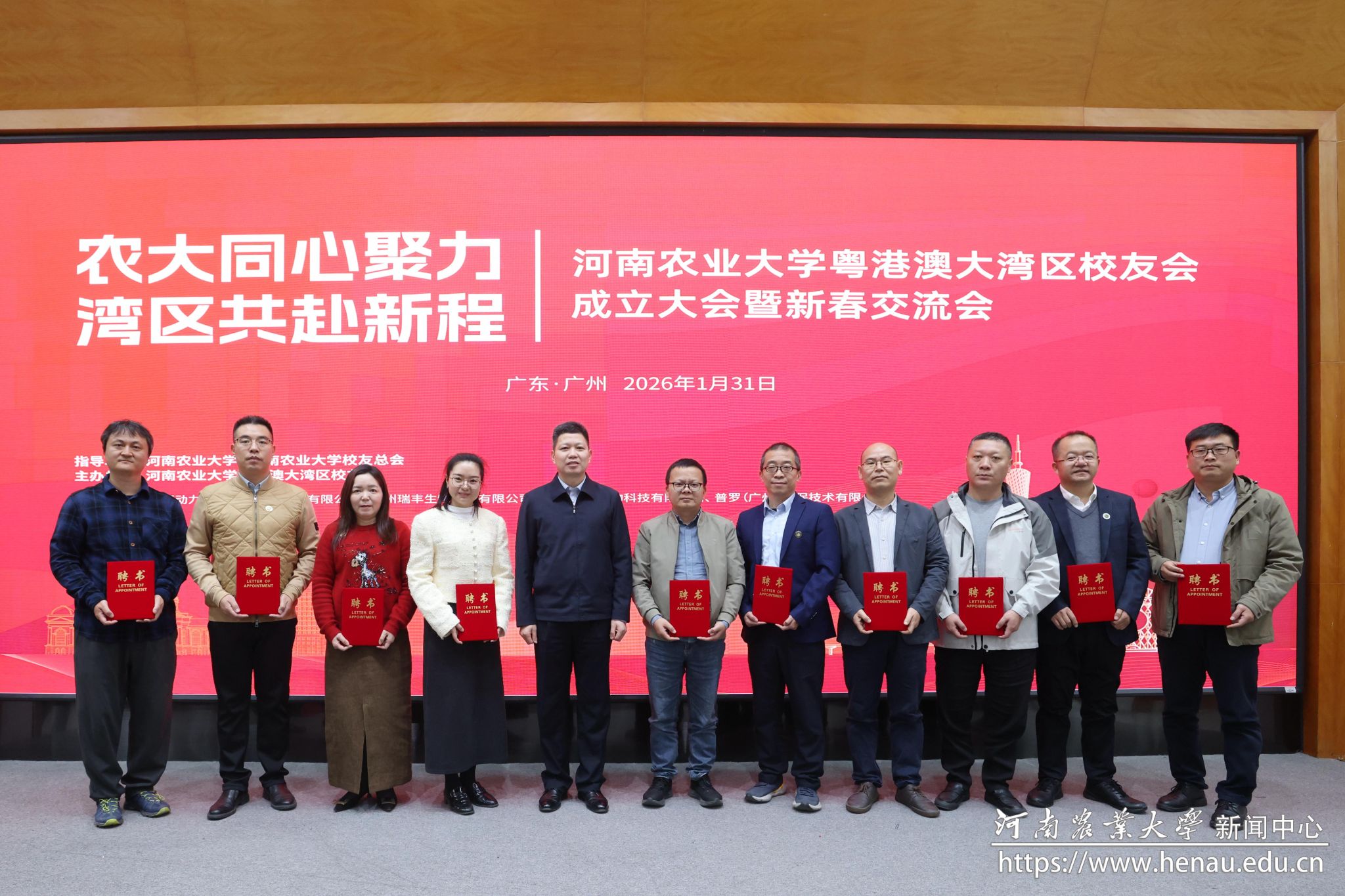 本网讯(通讯员 吴静)春潮涌动珠江畔,校友同心谱新篇。1月31日,我校粤港澳大湾区校友会成立大会暨新春交流会在广州举办。河南省人民政府驻广州办事处副主任桑彦,广东省河南商会副会长吴大成,华南农业大学对外联络处处长、校友总会秘书长周艳华出席会议。我校校友联络办公室和相关学院负责人、兄弟高校广东校友会负责人、地方和行业校友组织代表与大湾区各行各业校友代表齐聚一堂,共同见证这一承载着深厚校友情谊与发展期盼的重要时刻。