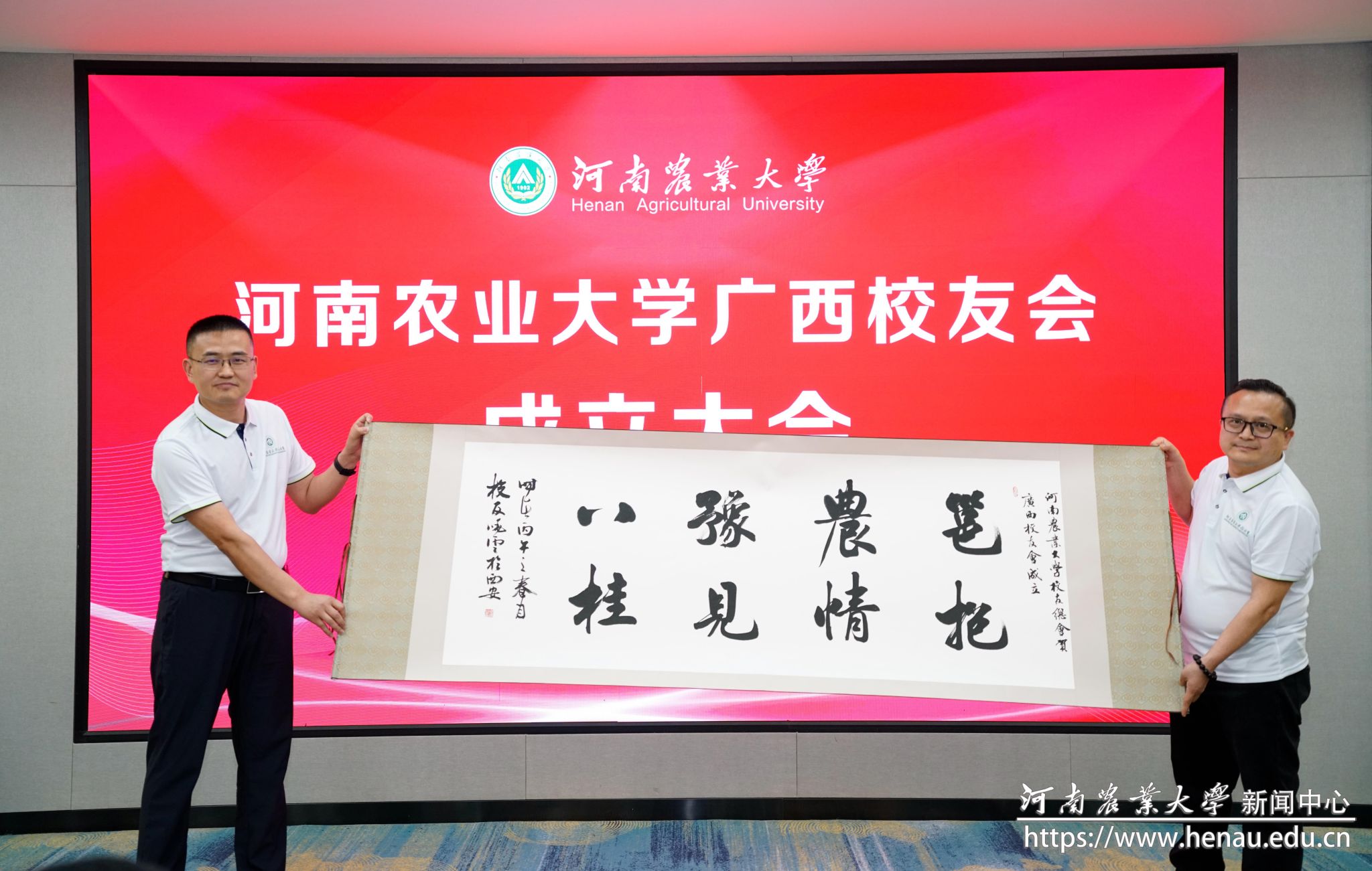 郭战伟向广西校友会授会牌、会旗,并为第一届理事会负责人颁发聘书。2004级艺设专业校友、西安市书法家协会副秘书长李晓云向广西校友会赠送墨宝,寓意在桂校友同心同向、情谊长存。