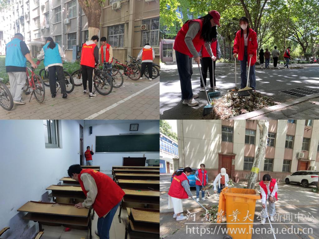 学院师生志愿者仔细清理校园内的树叶、柳絮,维护教学楼卫生环境并规范摆放非机动车辆。身着红蓝马甲、辛勤劳动的志愿者身影,形成了一道道靓丽的风景线,勾勒出校园整洁有序的学习生活环境,展现了农大学子勤劳文明的精神风采。