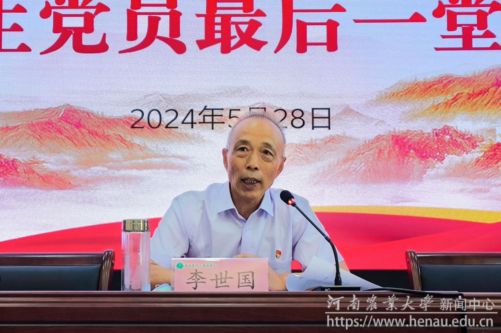 本网讯(通讯员 田原)为坚定毕业生理想信念,厚植爱国情怀,5月28日,林学院于龙子湖校区举行“永葆初心 扬帆起航”2024届毕业生党员最后一堂党课活动。校关工委执行副主任兼秘书长李世国担任主讲人。林学院2024届全体毕业生党员参加活动。