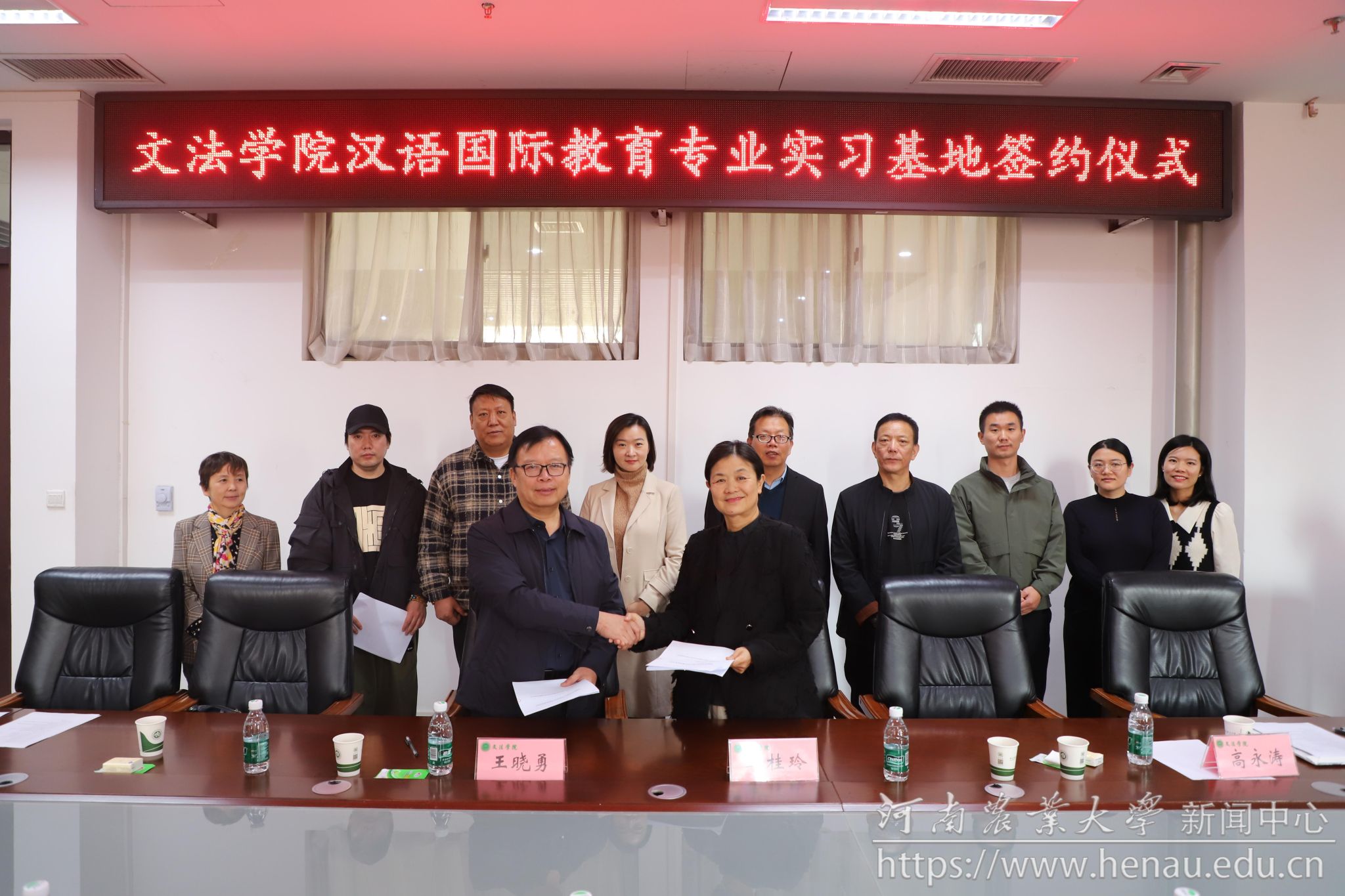 本网讯(通讯员 郑亚豪)11月6日,文法学院与郑州市非遗保护和文旅文创融合发展中心、开封市大宋黄庭坚研究会签署汉语国际教育专业实习基地协议。文法学院党委书记牛娟、郑州市非遗保护和文旅文创融合发展中心主任李桂玲、开封市大宋黄庭坚文化研究会会长高永涛,以及三家单位相关负责同志和教师代表参加签约揭牌仪式。