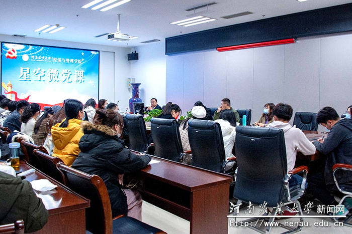 本网讯(通讯员 余月圆 图片 汪紫君)11月28日,经济与管理学院“星空微党课”在龙子湖校区开讲。经济与管理学院党委书记牛青杨以《深入学习十九届六中全会 努力在新时代的奋斗中更加出彩》为题进行了第一次授课。学院研究生第一、第二党支部全体党员及部分入党积极分子参加活动。
