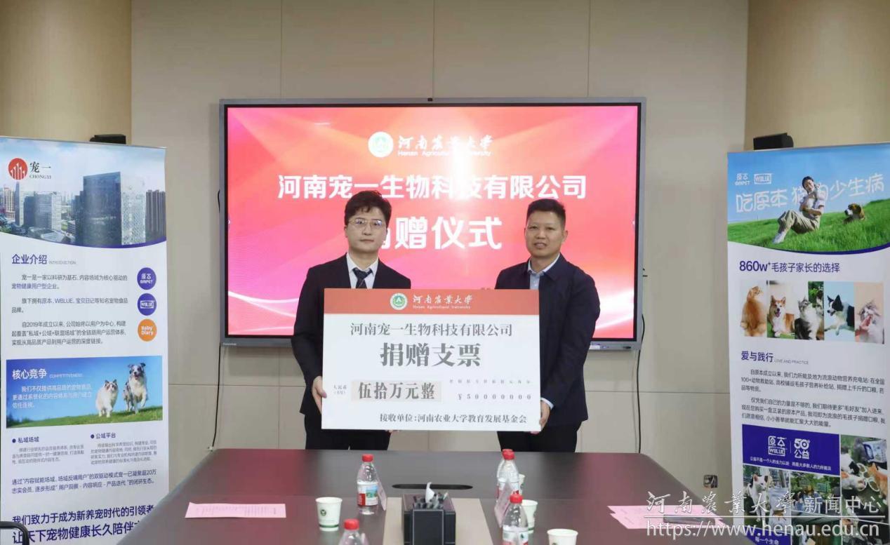 本网讯(通讯员 司雪萌)10月27日,河南宠一生物科技有限公司捐赠仪式在龙子湖校区举行。河南宠一生物科技有限公司创始人赵光彪,校友联络办公室、动物科技学院、国际教育学院负责人,动物科技学院教师代表参加仪式。