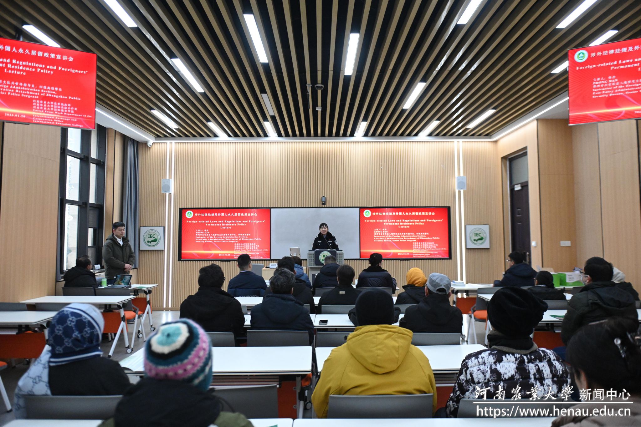 本网讯(通讯员 刘洋 邓然 图片 李培亚)1月20日,学校邀请郑州市公安局出入境管理支队外管科指导员、四级高级警长钟丹来校作涉外法律法规及外国人永久居留政策宣讲。党委统战部、国际交流合作处、国际教育学院相关负责人,在校外籍专家及外国留学生参加宣讲会。