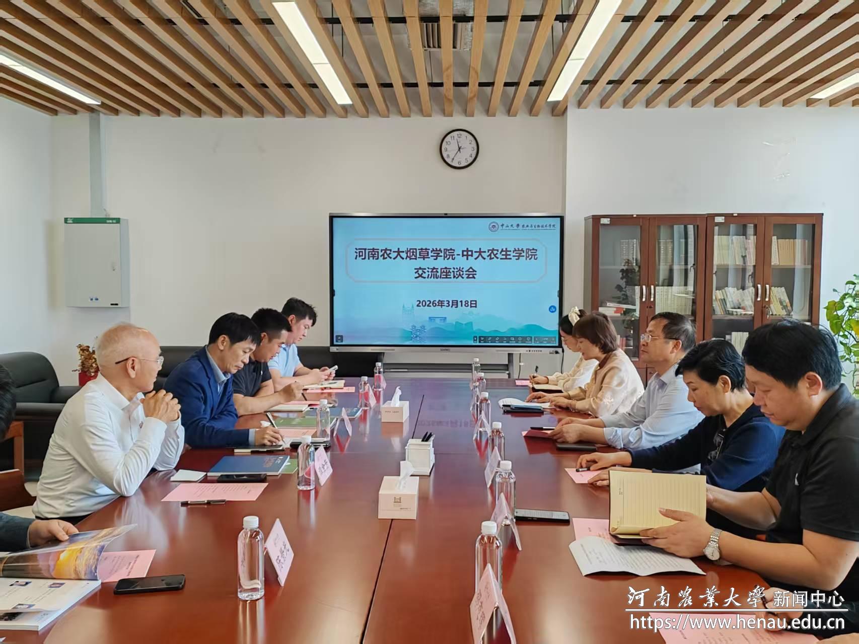 本网讯(通讯员 邵志晖)岭南三月,木棉花开。近日,烟草学院赴中山大学农学与生物技术学院开展座谈交流。中山大学农学与生物技术学院党委书记杨德胜、原院长谭金芳教授及有关教师代表参与座谈。双方围绕“新农科”建设、学科交叉融合、智慧农业、产教融合及人才培养等主题进行深入交流。会议由杨德胜主持。