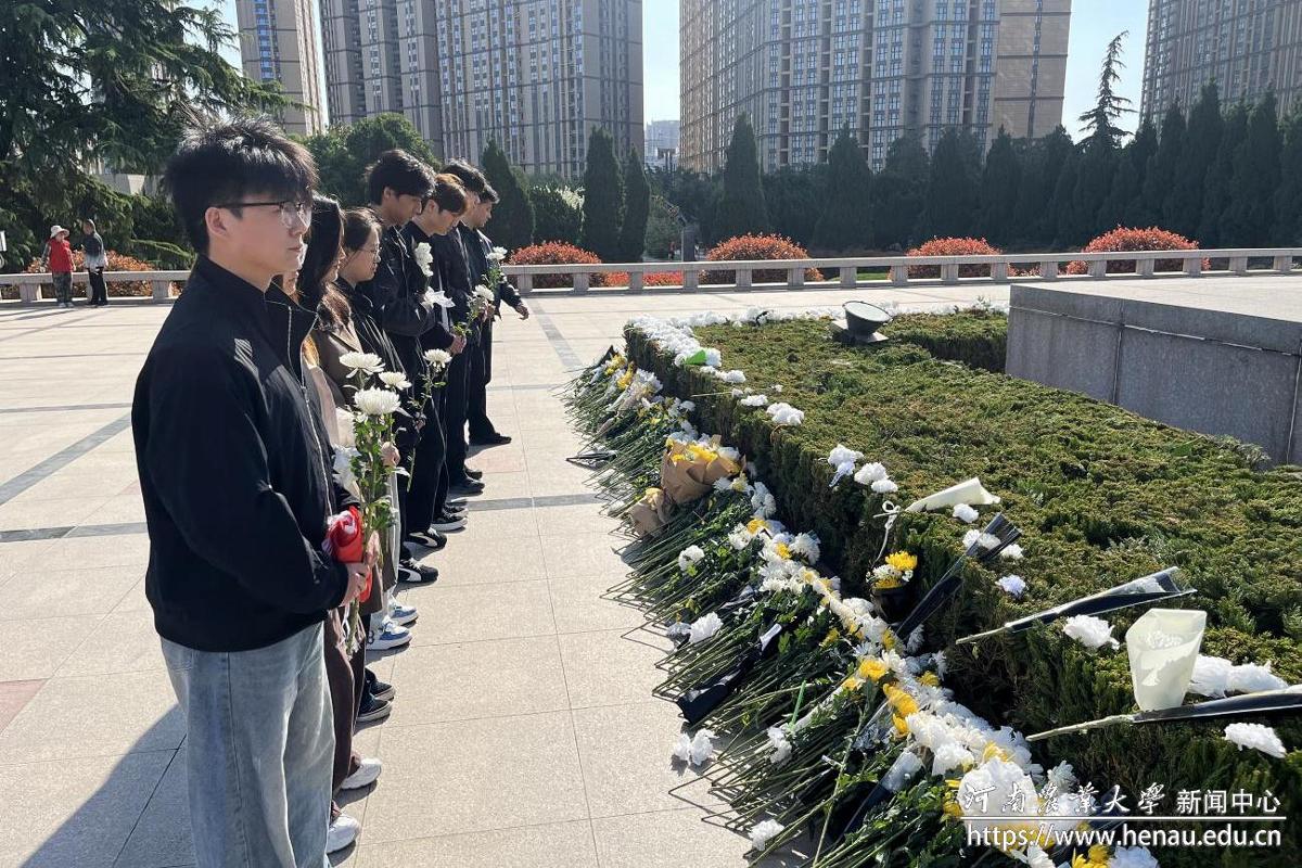 同学们在郑州烈士陵园纪念碑前敬献菊花