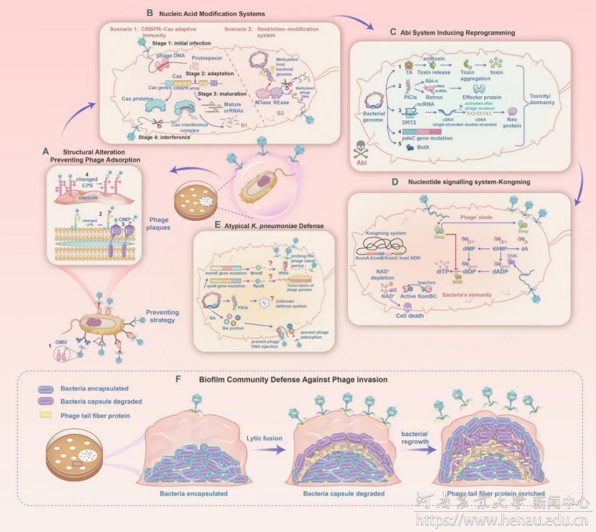 基于上述进展,团队继续聚焦噬菌体抗KP领域,重点针对KP噬菌体抗性产生机制和抑制策略展开专题综述。文章首先梳理了KP对噬菌体抗性的时空演化特征,指出受体阻断机制在现有研究中占据主导地位(图2)。提出两种假说:进化轨迹假说与研究偏见假说。前者认为,KP与噬菌体经历长期共进化可导致净化选择,使防御机制逐渐偏向受体修饰,并削弱其他防御体系;此背景下,受体阻断优势体现了真正的进化优化。以 CRISPR-Cas 抗性系统为例,尽管其存在于约三成KP基因组中,但临床上受体介导抗性仍占首位。这可能源于受体突变在数代细菌内即可实现快速逃逸,而 CRISPR 抗性则需要经历间隔子获取与功能表达等复杂过程。此外,CRISPR 系统存在并不等同于有效防御,部分系统可能因缺少关键组分或间隔子库陈旧而处于非活跃状态。故,其表面修饰更像是“第一道快速防线”,而 CRISPR 则可能承担长期适应性免疫的角色,这一区分对于理解临床环境中抗性动态具有重要意义。