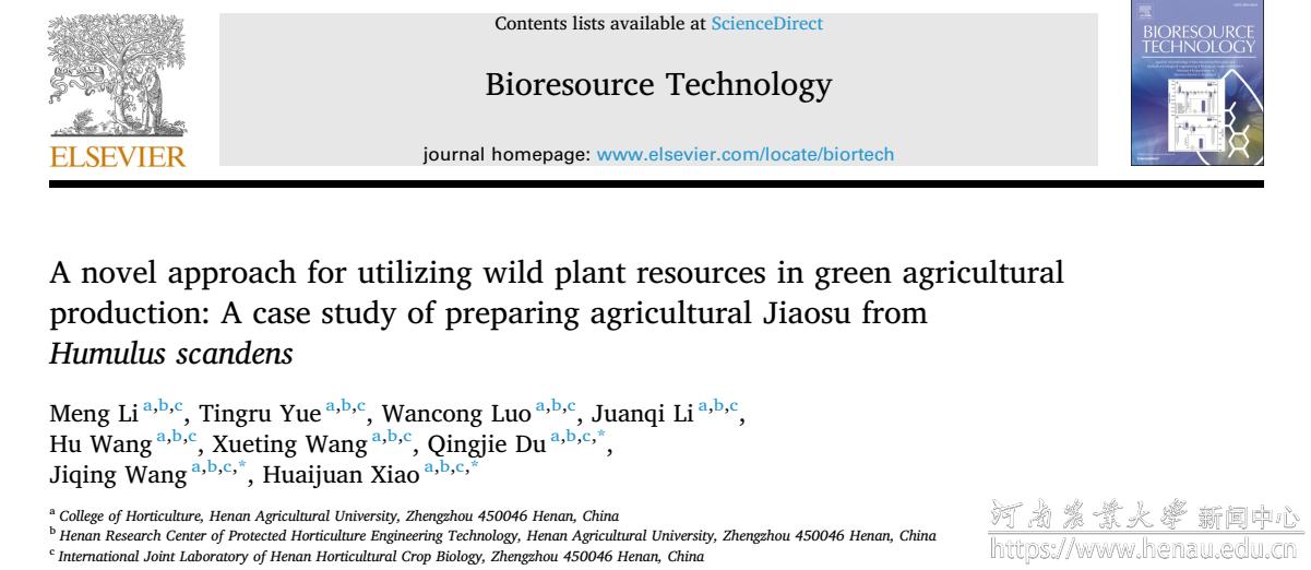 本网讯(通讯员 李猛)近日,我校园艺学院设施蔬菜栽培科技创新团队在环境科学与生态学领域一区TOP期刊《Bioresource Technology》上发表了题为《A novel approach for utilizing wild plant resources in green agricultural production: A case study of preparing agricultural Jiaosu fromHumulus scandens》的研究论文。该研究系统探讨了利用五种常见野生植物(葎草、绞股蓝、齿果酸模、泽漆、马齿苋)制备农用酵素的可行性,并深入解析了其在提升作物品质、改良土壤微生态等方面的作用机制,为野生植物资源的高值化利用与农业绿色转型提供了新路径。