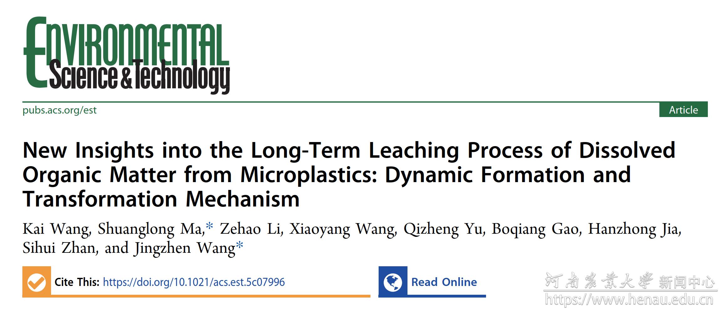 本网讯(通讯员 马双龙)近日,我校资源与环境学院环境监测与污染控制科技创新团队在微塑料溶解性有机质释放动力学和分子转化机制方面取得研究进展,研究成果以“New Insights into the Long-Term Leaching Process of Dissolved Organic Matter from Microplastics: Dynamic Formation and Transformation Mechanism”为题,发表在环境领域顶级期刊《Environmental Science & Technology》。
