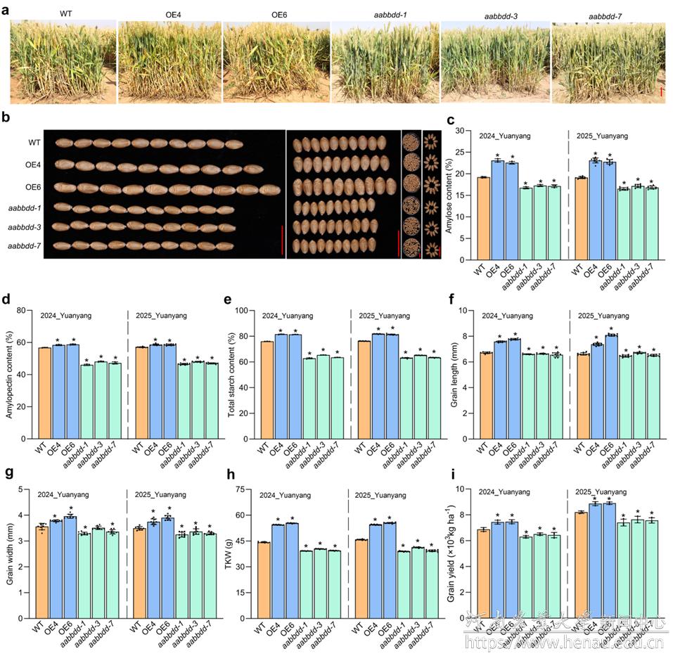 腺苷葡萄糖焦磷酸化酶(AGPase)是控制作物淀粉合成的关键酶,该团队发现bHLH转录因子家族一个成员—TaPIL1能与淀粉合成酶胞质型小亚基基因(TaAGPS1a)启动子结合,该基因的敲除和过量表达两类转基因材料的籽粒淀粉含量、粒重及产量发生了显著变化,发现TaPIL1能正向调控小麦籽粒淀粉的合成,进而提高了粒重和籽粒产量(图1)。