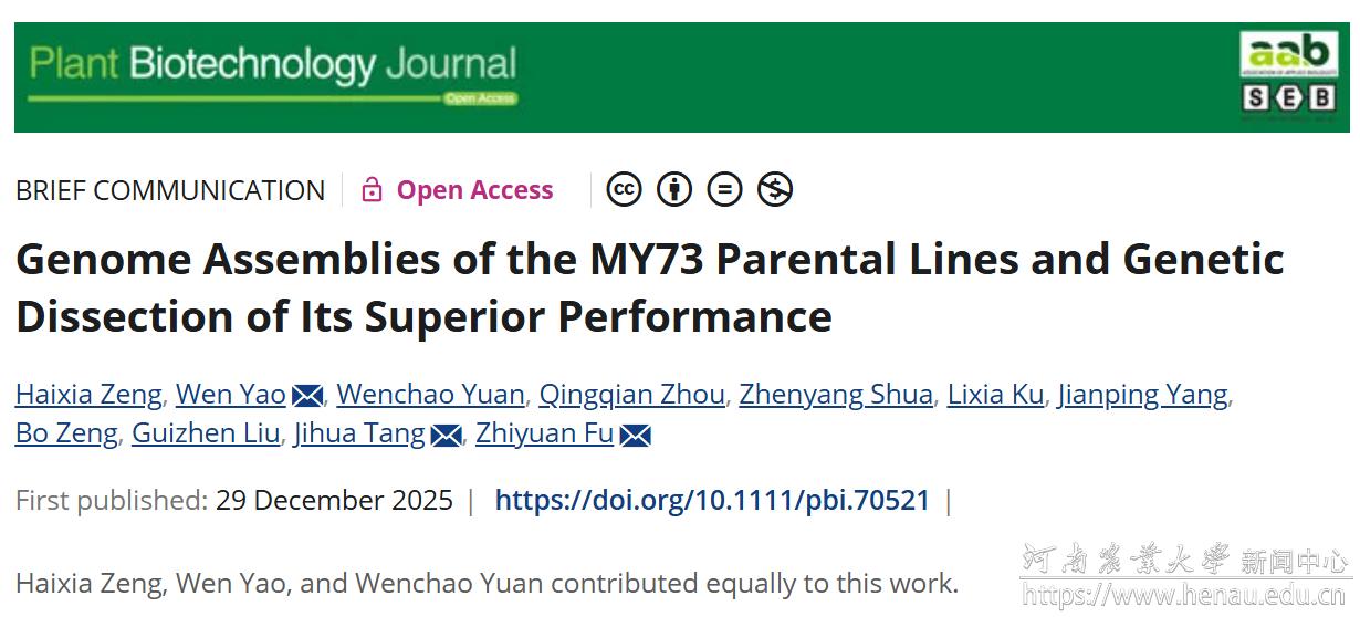 本网讯(通讯员 徐佳亮)近日,《Plant Biotechnology Journal》杂志在线发表了由我校汤继华、付志远、姚文团队撰写的“Genome assemblies of the MY73 parental lines and genetic dissection of its superior performance”研究论文。该研究组装了2023年至2025年我国农作物推广面积第一位的玉米品种MY73两个亲本的高质量基因组,并通过与郑单958(Zhengdan958)双亲基因组进行比较,系统解析了MY73高产、耐密、抗病等优异性状形成的遗传基础,并挖掘到株高关键调控基因ZmPH2-1,为未来玉米的“基因组设计”育种提供了宝贵的基因资源和理论支撑。