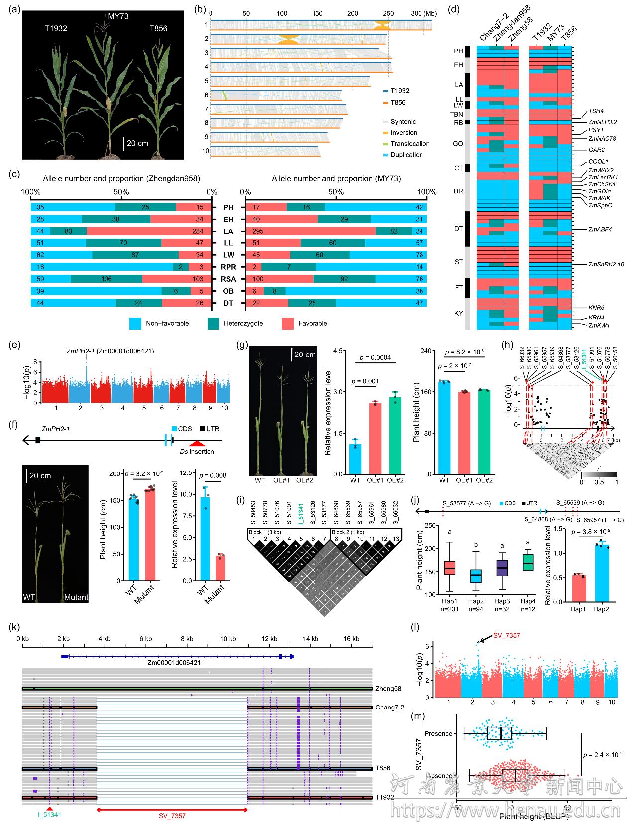 降低株高是密植高产育种的核心。尽管MY73株型优异,但在株高(PH)性状上,其优异等位基因的比例(22.7%)仍有较大提升空间。为了鉴定控制株高的关键基因,研究团队利用GWAS分析结合Ac/Ds转座子突变体库及过表达转基因验证,成功克隆了一个株高负调控基因——ZmPH2-1(图1a–h)。
