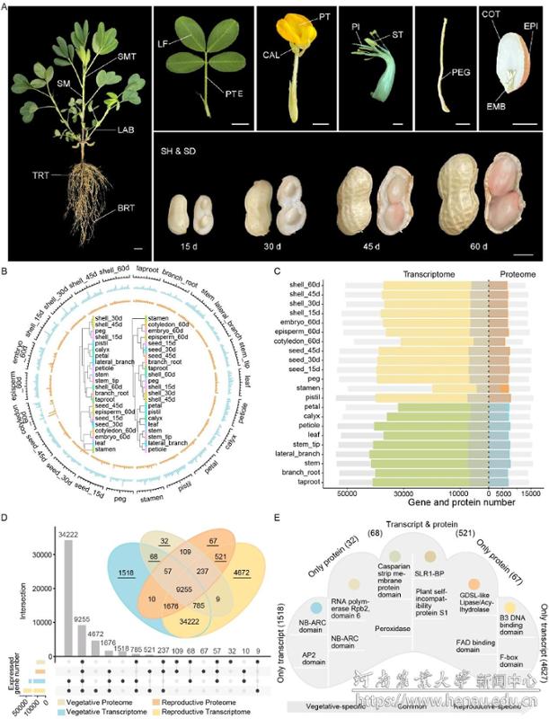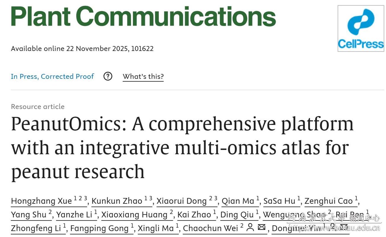 本网讯(通讯员 杨航)近日,我校殷冬梅教授联合上海交通大学韦朝春教授研究团队,在《Plant Communications》期刊发表题为“PeanutOmics: A comprehensive platform with integrative multi-omics atlas for peanut research”的论文。该研究构建了花生全生育期22个组织转录组、蛋白质组与代谢组的全景图谱,并推出首个花生多组学数据平台PeanutOmics。该研究为解析花生生长发育机制、挖掘关键功能基因提供了全新工具,将显著加速花生分子育种进程,为保障全球油料作物安全提供重要支撑。