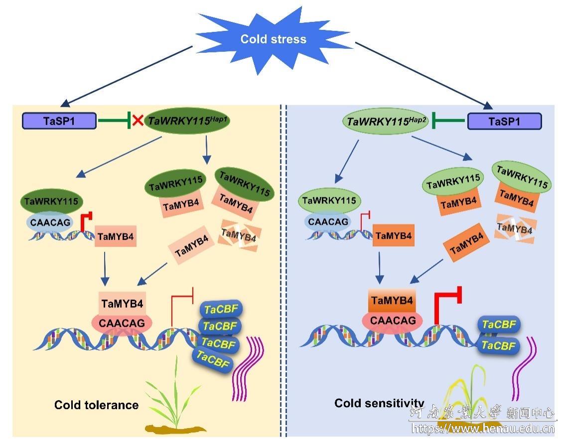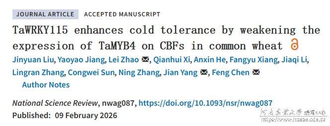 本网讯(通讯员 杨航)近日,我校陈锋教授课题组/宁波大学植物病毒研究所羊健研究员团队在《National Science Review》(IF=17.1)上发表了题为“TaWRKY115 enhances cold tolerance by weakening the expression of TaMYB4 on CBFs in common wheat”的研究论文。该研究成功克隆了正调控小麦低温抗性的关键基因TaWRKY115,对其基因功能进行验证,并对其作用机制进行解析。该成果不仅为阐明小麦响应低温的分子机制提供新的见解,而且为小麦抗逆育种提供了宝贵的基因资源。