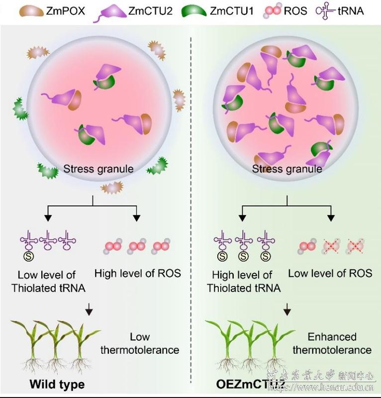 本研究发现,细胞质tRNA 硫醇化蛋白 ZmCTU2 是玉米耐热性调控网络的核心因子,其表达水平与高温环境下玉米籽粒结实率呈显著正相关。过表达 ZmCTU2 能显著提升玉米幼苗期与成株期的耐热能力,有效提高热胁迫下植株存活率及田间产量;而 ZmCTU2 及其互作蛋白 ZmCTU1 的功能缺失突变体,均呈现严重的种子发育缺陷及致死表型。机制解析表明,热胁迫条件下 ZmCTU2 定位于应激颗粒中,通过特异性招募 ZmCTU1 及活性氧清除相关过氧化物酶,避免其受热胁迫降解,形成双重保护机制:一是维持 tRNA 硫醇化修饰效率,保障翻译过程的准确性;二是稳定抗氧化酶系统功能,强化细胞氧化还原稳态。本研究明确 ZmCTU2 作为应激颗粒支架蛋白,可协同调控蛋白质稳态与抗氧化通路,为玉米耐热性遗传改良提供了关键基因资源与理论支撑。
