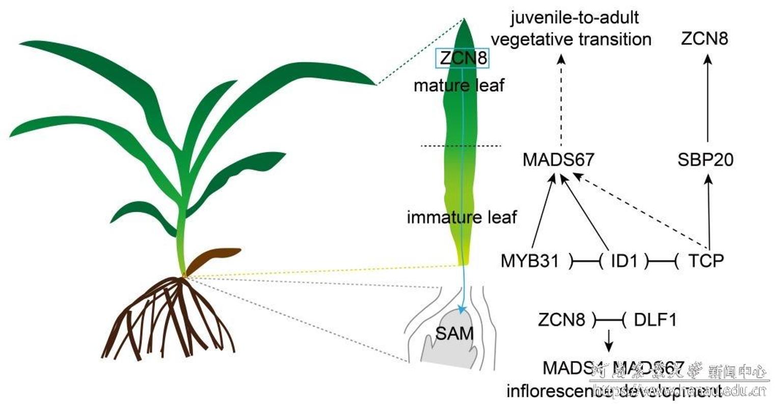 开花是植物从营养生长转向生殖生长的关键转折点,对作物产量至关重要。玉米作为重要的粮食作物,其开花时间受到光周期和自主途径(与内部发育信号相关)的双重调控。在光周期不敏感的温带玉米中,INDETERMINATE1 (ID1)是自主开花途径的核心调控因子,但其表达局限于幼嫩叶片的基部,关于其如何调控SAM中花器官基因的表达进而影响生殖转换和开花时间的具体作用机制长期未明。河南农业大学汤继华/付志远教授团队在这一问题的研究中取得了突破。主要研究结果如下: