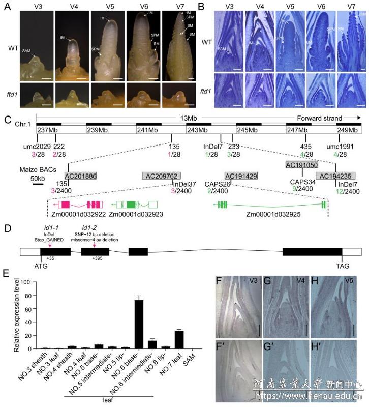 对田间发现的一个无生殖生长的自然突变体ftd1进行通过图位克隆和互补验证,证实ID1基因功能丧失是导致ftd1无法完成生殖转化的关键原因(图1)。
