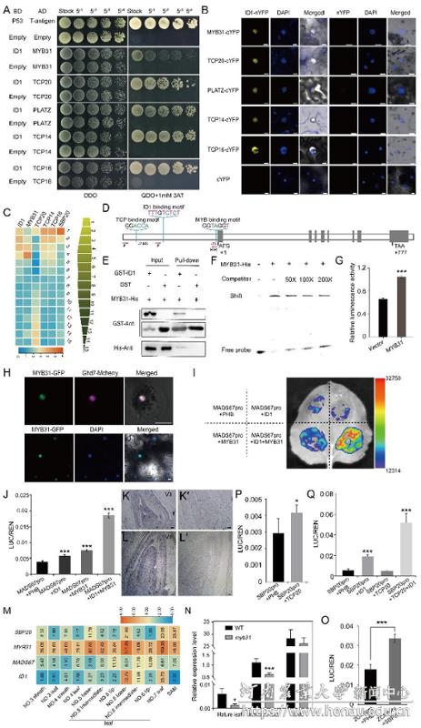 鉴于ID1的表达局限于幼嫩的叶片基部且无明确的可移动能力,筛选了ID1的潜在辅助因子。酵母双杂交、BiFC和Pull-down实验验证MYB31和TCP14/16/20是ID1的互作蛋白。双荧光素酶实验显示,ID1与MYB31或TCP20共表达时,对MADS67的激活效果显著增强,揭示ID1互作蛋白与ID1能协同激活下游靶基因(图3)。