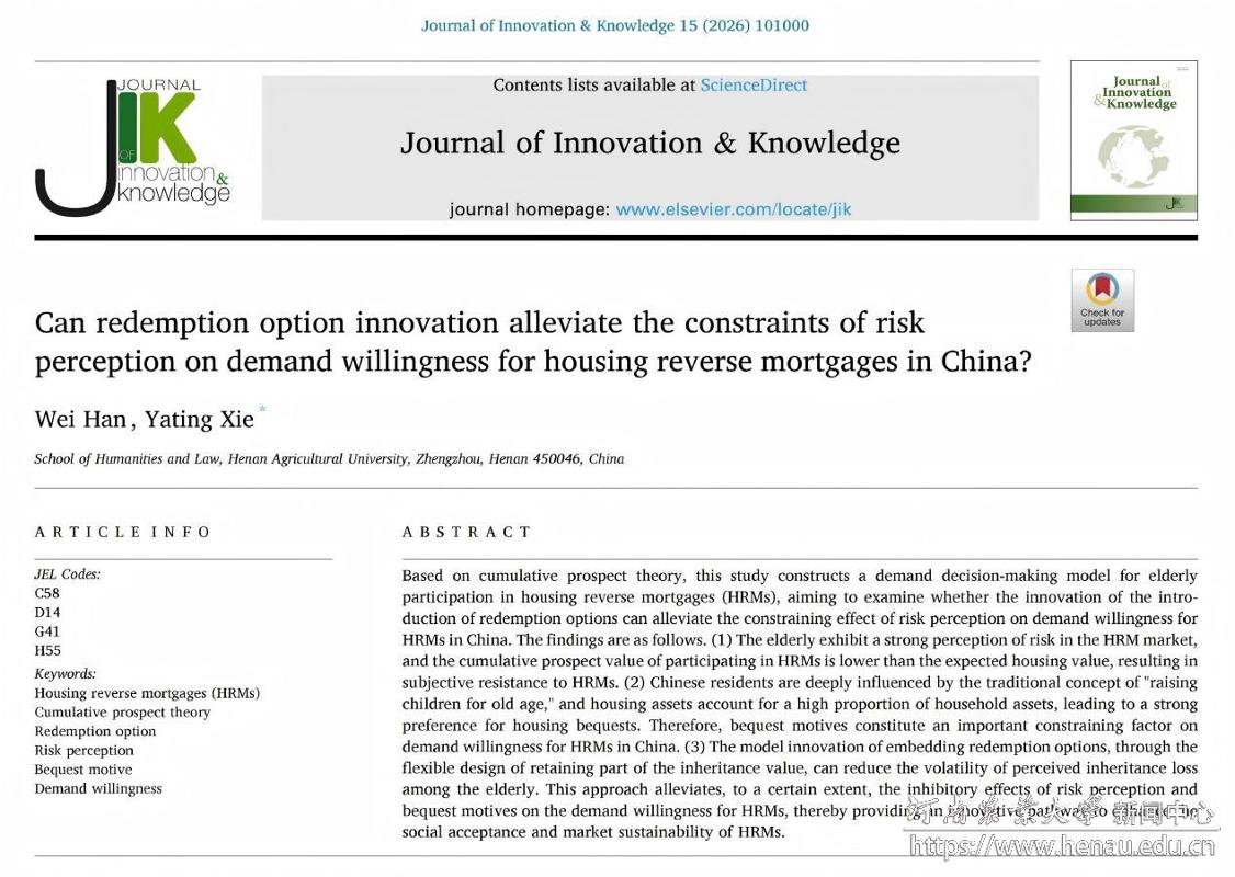 本网讯(通讯员 韩威 盛戈)近日,我校文法学院社会学学科韩威团队在国际权威期刊《Journal of Innovation & Knowledge》上发表了题为《Can redemption option innovation alleviate the constraints of risk perception on demand willingness for housing reverse mortgages in China》的研究论文。该论文系统分析了基于累积前景理论研究住房反向抵押养老保险的相关问题,深入探讨了我国居民养老需求。