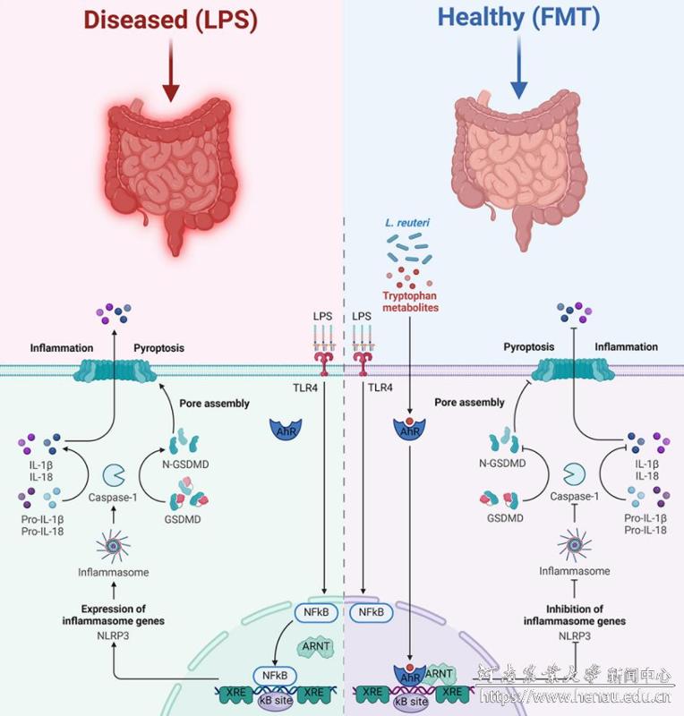 结合Caco-2细胞、结肠类器官以及基因敲除小鼠的研究表明,Lactobacillus reuteri衍生的关键色氨酸代谢物可以作为AhR的配体,激活AhR进入细胞核,进而抑制NLRP3炎症小体的转录,有效阻断细胞焦亡的发生。这一系列变化不仅减轻了肠道炎症,还显著增强了肠道紧密连接蛋白的表达,促进了肠道上皮屏障的稳态和修复。