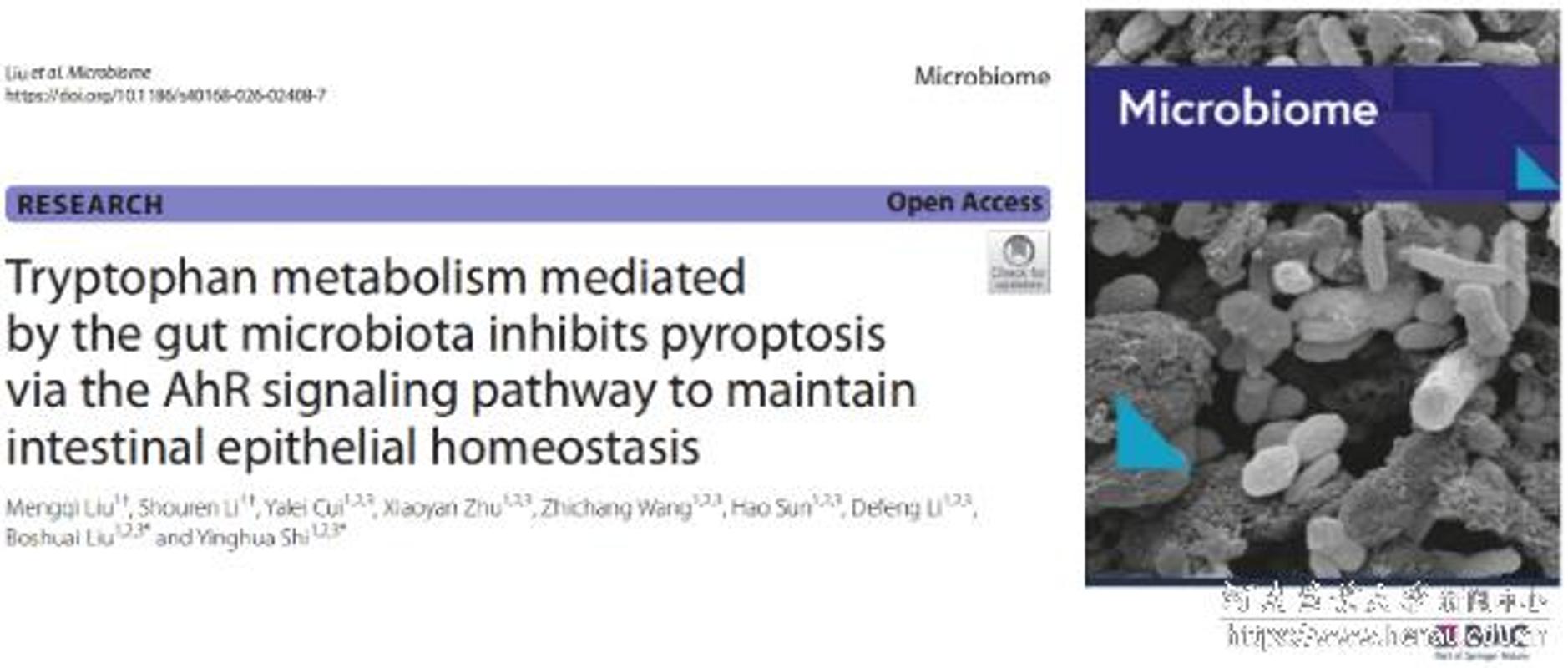 本网讯(通讯员 刘孟琦)近日,我校动物科技学院史莹华教授团队在国际微生物学著名期刊《Microbiome》在线发表了题目为“Tryptophan metabolism mediated by the gut microbiota inhibits pyroptosis via the AhR signaling pathway to maintain intestinal epithelial homeostasis”的研究论文。该研究揭示了肠道微生物介导的色氨酸代谢通过AhR信号通路抑制细胞焦亡维持仔猪肠道上皮稳态的机制,为开发新型肠道健康调控策略提供了新视角,为仔猪肠道炎性疾病的防治提供了新思路。