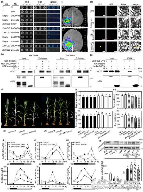 酵母双杂交实验鉴定结果显示,全长ZmCOP1a和ZmCOP1b均能与ZmCOL3发生直接互作,而其突变体蛋白则丧失该互作能力(图3a)。该互作关系进一步通过Pull-down、荧光素酶互补(LCI)、双分子荧光互补(BiFC)及免疫共沉淀(Co-IP)实验得到验证(图3a–e)。通过MEMD数据库(http://maizeems.qlnu.edu.cn/)筛选,研究团队获得了一个提前终止的zmcol3突变体(Trp68-to-stop);该突变体在长日照条件下表现出早花(提前1.5天)和早吐丝(提前1.2天)的表型,而ZmCOL3过表达株系则呈现开花和吐丝延迟的表型。遗传分析显示,zmcop1a/zmcol3和zmcop1b/zmcol3双突变体的表型与zmcol3单突变体相似(图3f–h)。ZmCOP1a、ZmCOP1b与ZmCOL3之间存在相互正调控效应,在白光处理4小时后,三者的转录水平同步达到峰值(图3i–l)。具体而言,zmcop1a/b突变体中ZmCOL3的转录水平和蛋白积累量均显著降低,而过表达株系中则显著升高(图3i);反之,zmcol3突变并不影响ZmCOP1a/b的表达水平,表明ZmCOP1a/b可在转录和翻译后水平正向调控ZmCOL3。综上所述,ZmCOP1a、ZmCOP1b与ZmCOL3三者协同作用于开花抑制通路,共同调控玉米的光周期开花响应。