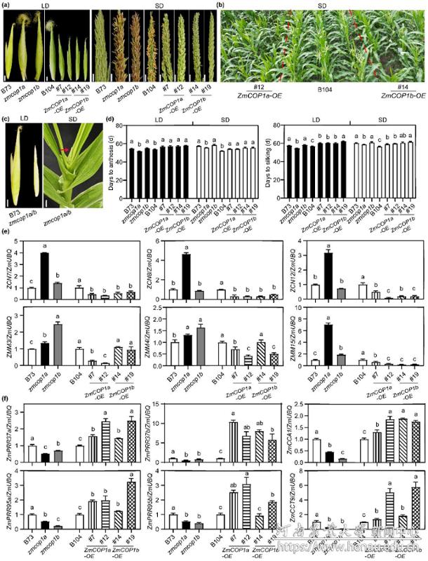 为系统解析ZmCOP1a和ZmCOP1b在玉米开花调控中的具体功能,本研究鉴定了EMS诱导的ZmCOP1a单突变体(zmcop1a)、ZmCOP1b单突变体(zmcop1b)、双突变体(zmcop1a/b),以及ZmCOP1a过表达株系(ZmCOP1a-OE)和ZmCOP1b过表达株系(ZmCOP1b-OE)。田间表型分析结果显示,在长日照和短日照条件下,zmcop1a突变体分别开花提早2.8–3.0天、吐丝提早1.5–2.0天,其过表达株系则开花延迟3.0–3.5天;zmcop1b单突变体开花时间无显著差异,但其过表达株系可开花延迟3.5天、吐丝延迟4.0–5.5天(图2a、b、d)。值得注意的是,zmcop1a/b双突变体表现出雄穗和雌穗发育严重缺陷的表型(图2c)。分子水平检测表明,zmcop1a突变体中成花素基因ZCN7/8/12及开花标记基因ZMM3/4/15的表达量显著上调,而过表达株系中上述基因的表达则受到明显抑制;光周期抑制基因ZmPRR37a/b、ZmPRR95a/b、ZmCCA1和ZmCCT9的表达模式则与之相反(图2e、f)。上述结果共同表明,ZmCOP1a和ZmCOP1b作为开花抑制因子,参与玉米开花时间的调控过程。