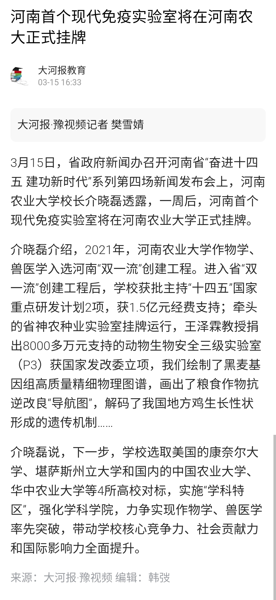 【新黄河】(2022年3月15日)河南首个现代免疫实验室将落户河南农业大学(点击图片查阅相关报道)