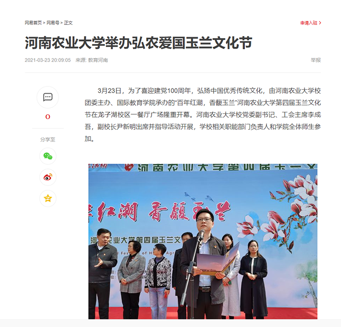 3月27日,由河南农业大学校团委主办、国际教育学院承办的“百年红潮,香馥玉兰”河南农业大学第四届玉兰文化节在龙子湖校区一餐厅广场隆重开幕。本届玉兰文化节以“相约玉兰,与春同行”为主题。伴着玉兰花香,陆续开展了“玉兰情·书影留香”、“玉兰苑·风情大观”、“玉兰杯·演讲比赛”、“玉兰令·诗词大会”、“玉兰春·风筝舞春”、“兰心蕙质·魅力女生节”等活动。活动中,大家赏玉兰、品玉兰、学玉兰,充分发掘校园景观建筑的文化内涵,积极弘扬中华传统文化,着力打造校园文化活动品牌,号召广大师生心怀感恩,奋发向上,受到了大家的欢迎。