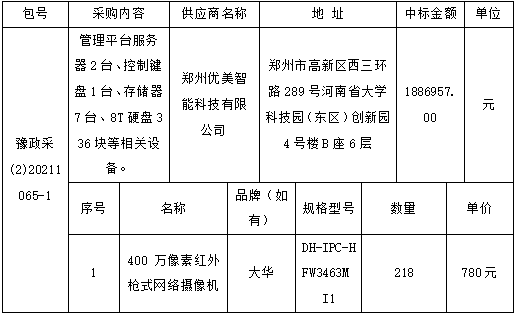 五、其他补充事宜本次中标公告在《河南省政府采购网》、《河南省公共资源交易中心门户网》上发布,中标公告期限为1个工作日。四、中标公告发布的媒介及中标公告期限