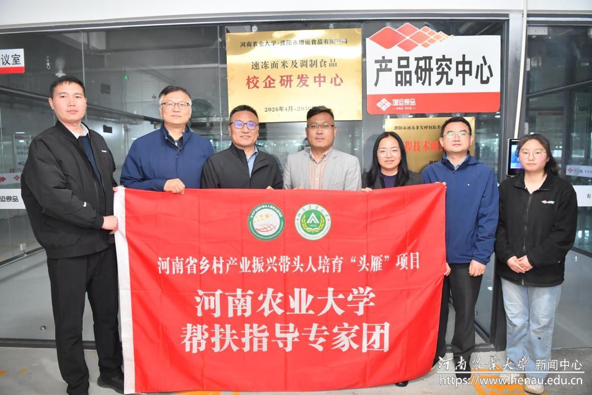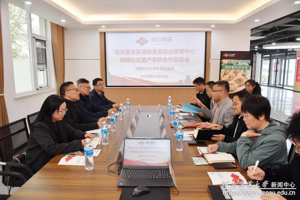 本网讯(通讯员 睢福庆 李真)如何让实验室的科研成果更快地走上生产线?学校与濮阳市增运食品有限公司的深度合作给出了一份务实答卷。4月8日,学校社会服务处相关负责人,食品科学技术学院潘治利、李真团队一行赴濮阳,与南乐县科技局副局长周峰、增运食品有限公司董事长郭月生共同为“河南农业大学速冻米面及调制食品校企研发中心”揭牌。该中心将围绕低GI食品研发、技术联合攻关等方向开展科研合作,并通过人才共育、实训基地共建、成果转化落地等多维度合作,形成产学研用深度融合的发展生态。