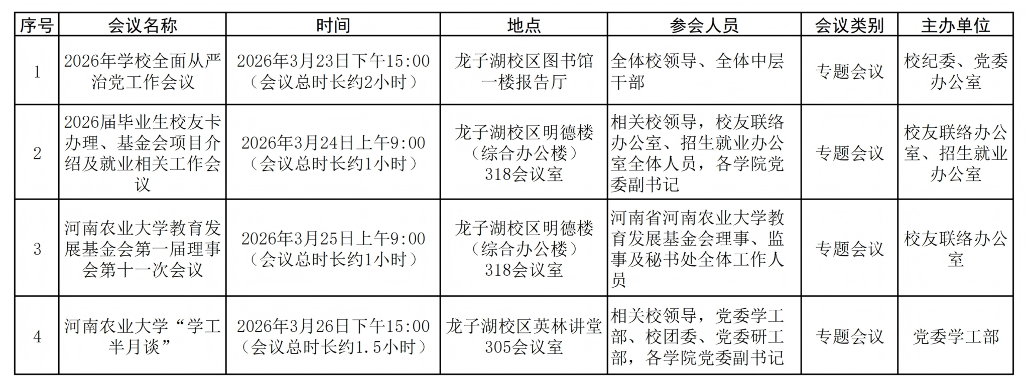 会议通知:2025-2026学年第二学期第四周会议安排(3月23日—3月29日)